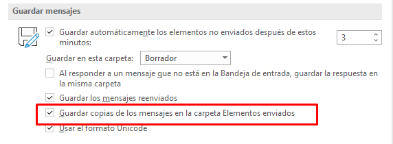 La opción destacada debe esta habilitado con el check, luego de realizar esto te comenzara aparecer los correos de la bandeja de elementos enviados.