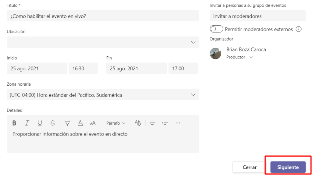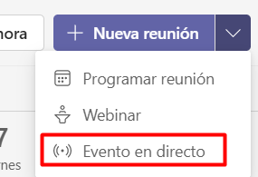 Cuando habilitas los eventos en vivo dentro de MS Teams lo podemos realizar desde el calendario, como se muestra en el ejemplo.