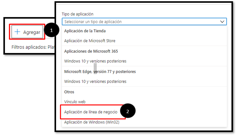 Luego selecciona Agregar, y vamos a la opción Aplicación de línea de negocio.
