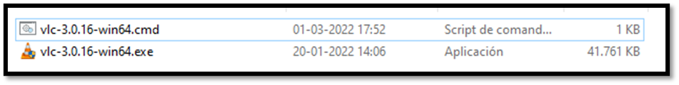 En el ejemplo se ejecuta como start vlc-3.0.16-win64.exe /L=1033 /S, esta instrucción no necesariamente sirva para todos los archivos .exe